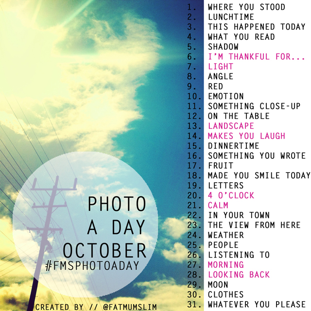 This month I am going to continue the Photo a Day Challenge hosted by Fat Mum Slim. Here is the next months prompts: