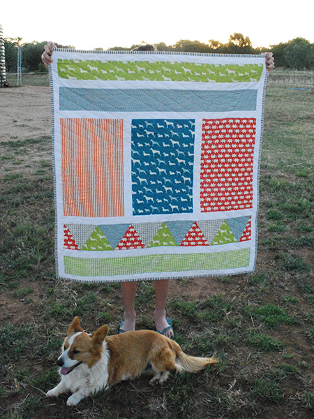 I ended up quilting concentric triangles on the 60/30 degree line. I found the cutest dog flannelette fabric at Spotlight, that seems like it was made especially to go with the range I used. Which reminds me, after three quilts, I am now officially out of that fabric! I’ve got a real thing for stripes on the binding at the moment, so some grey striped just finished it off nicely.