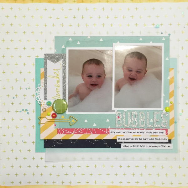 The first layout, Bubbles, was created for a Scrap the Girls challenge. One product I am loving at the moment is vellum. It is great to soften brighter papers. Oh my sweet baby, where has the time gone?!
