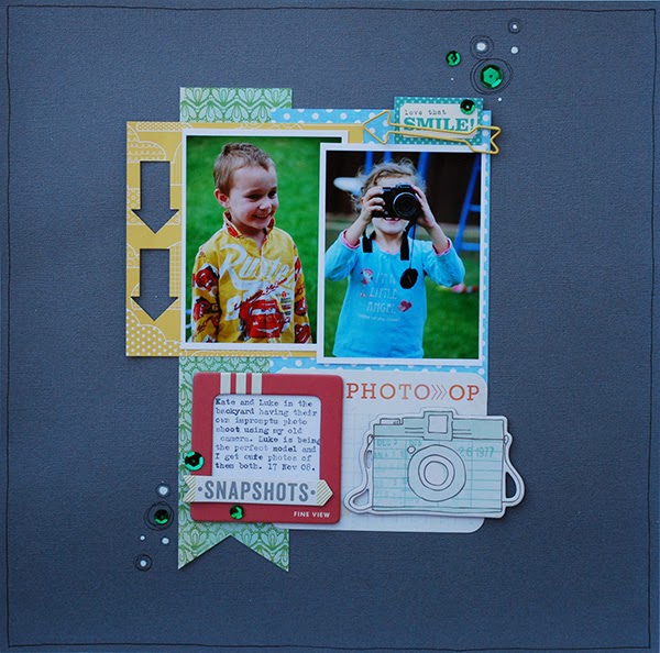 Too easy. These photos were taken way back when I first got my SLR. Kate was playing around with my old camera and taking photos of Luke. I also had that big-arsed chipboard camera embellishment that filled the spot perfectly.