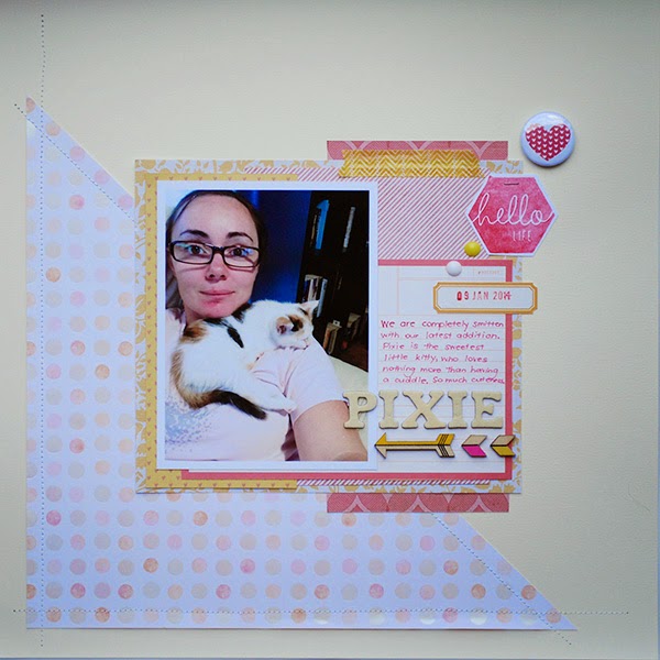 What a cute layout!! Love the soft pastels, and Pixel is very very cute!! Love little kitties (not so much when they get big and annoying though, like my two! lol!) Thanks for playing along! 🙂